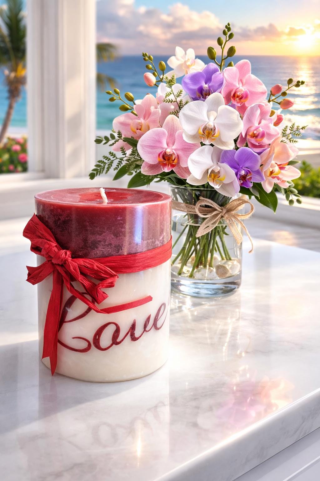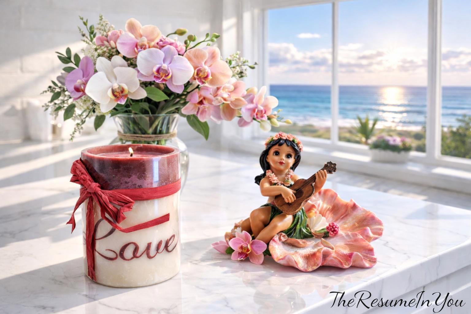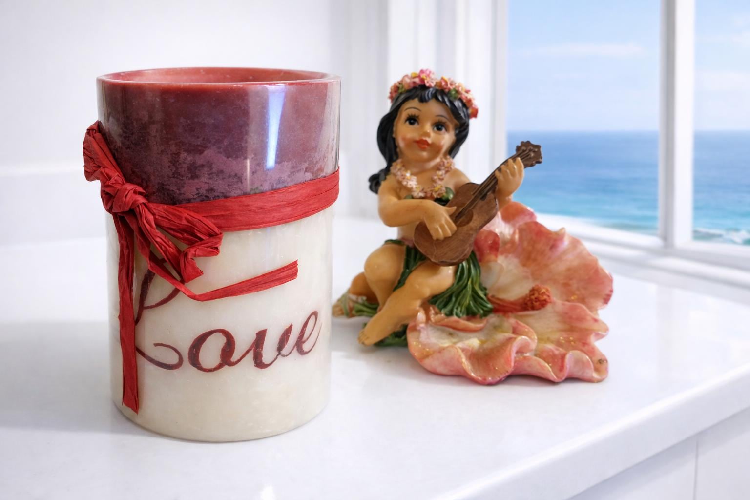 Infuse your space with warm, seaside charm using our LOVE Candle with Pastel Orchid Bouquet & Hula Girl Décor Combo — styled on a crisp, bright white countertop with a sunlit ocean backdrop. This beautiful scene takes a standout product photo and a must-have décor accent piece that’s ideal for living rooms, bathrooms, entryways, or cozy nooks.