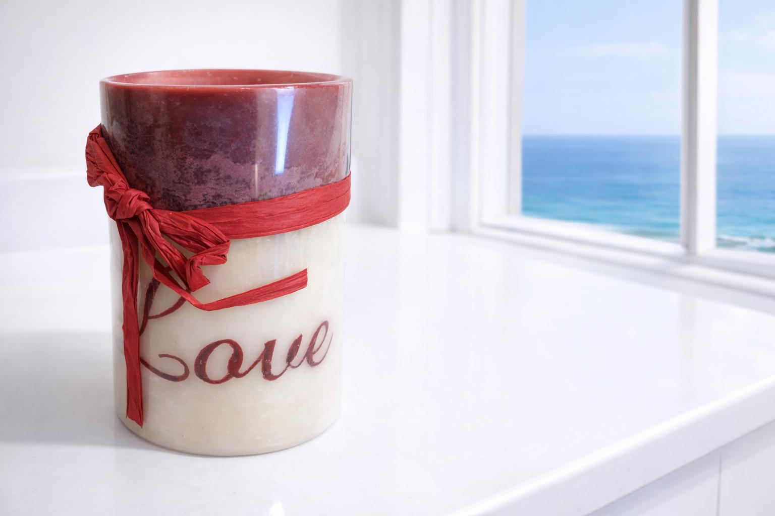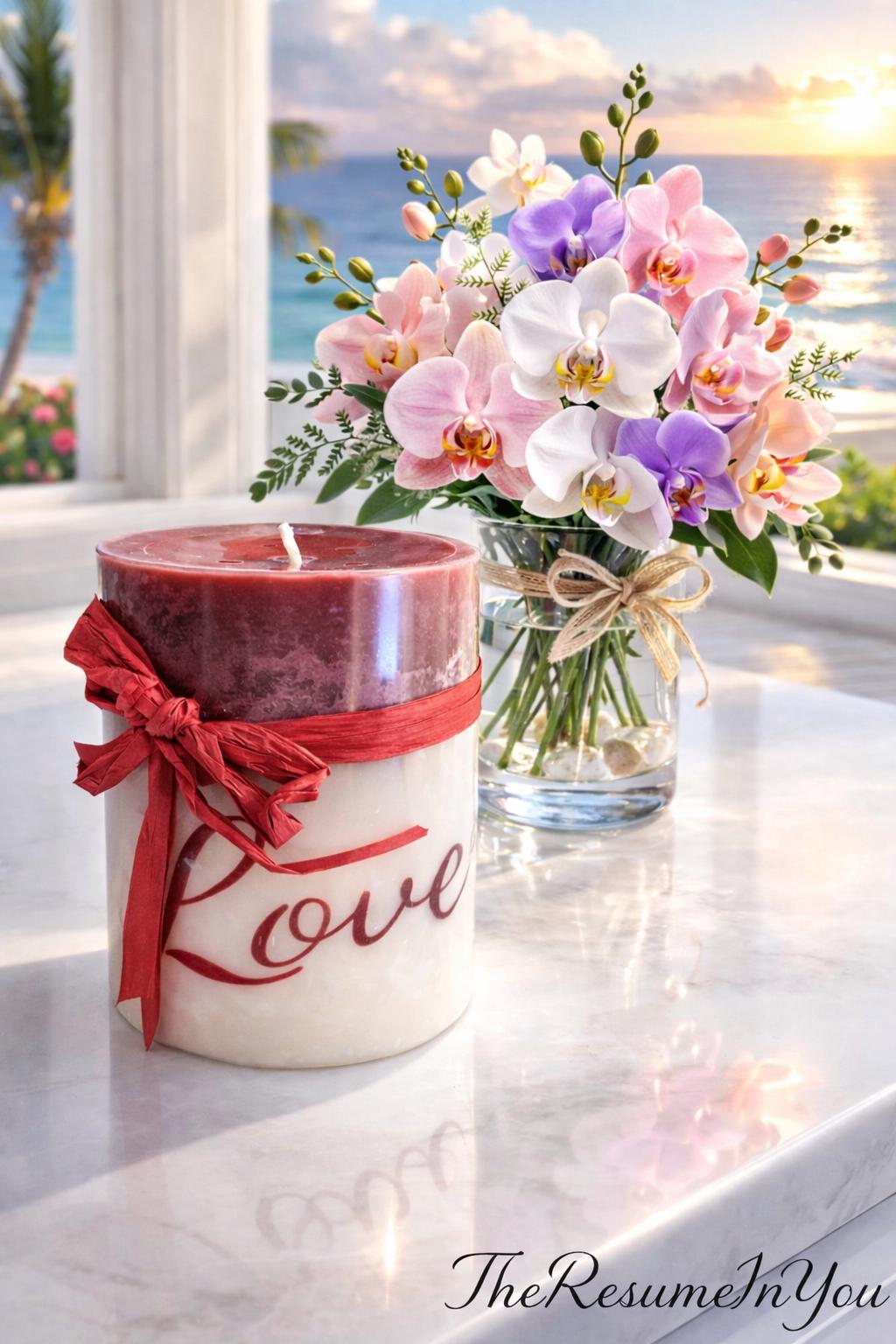 Coastal Candle Gift • LOVE Candle with Pastel Orchid Vase & Hula Girl • Bright White Marble Counter Décor • Ocean View Photo • Beachy Home Accent