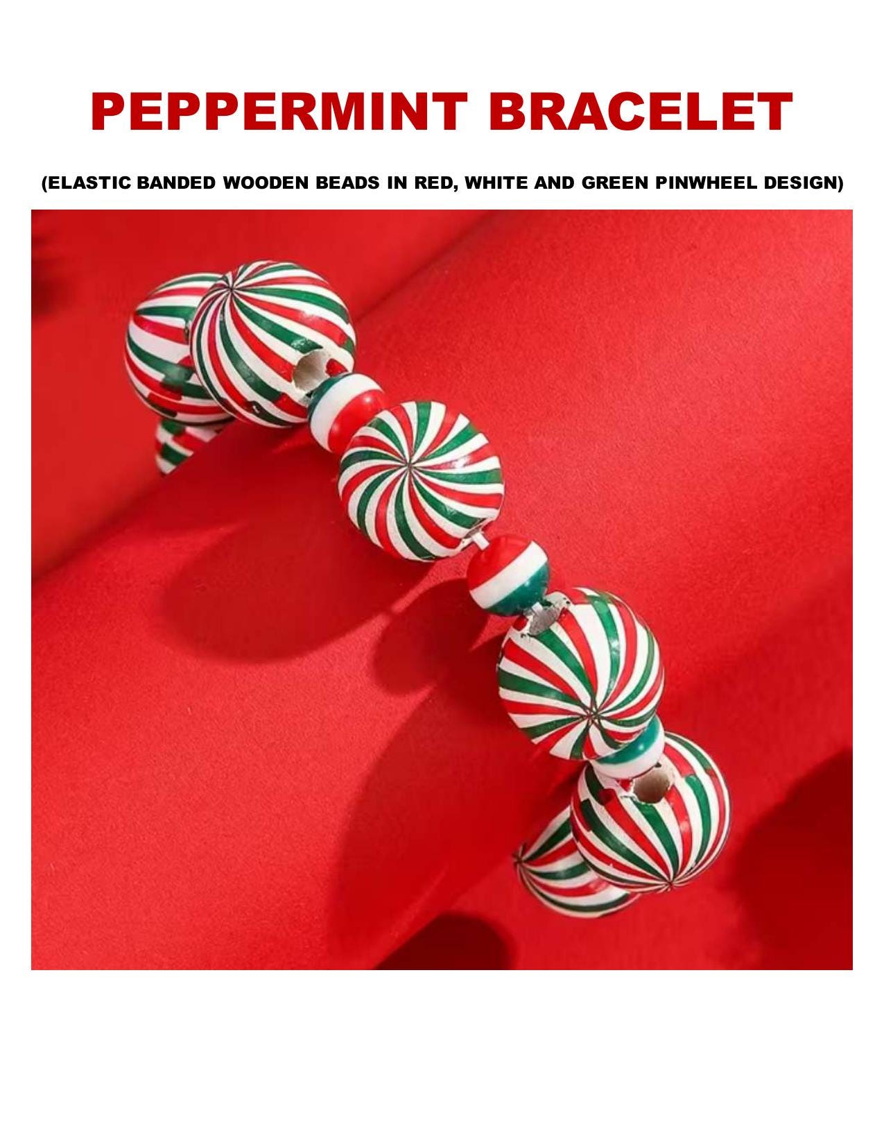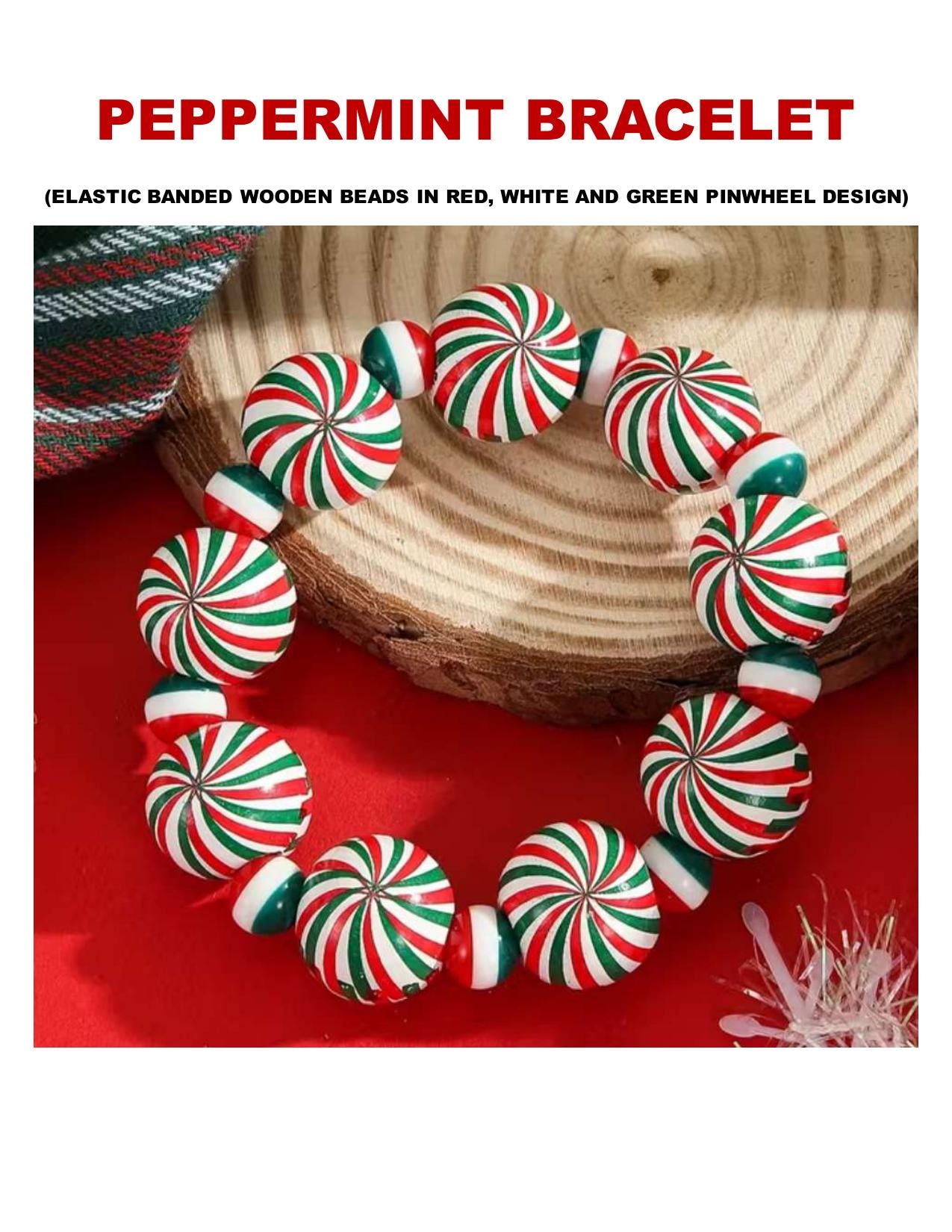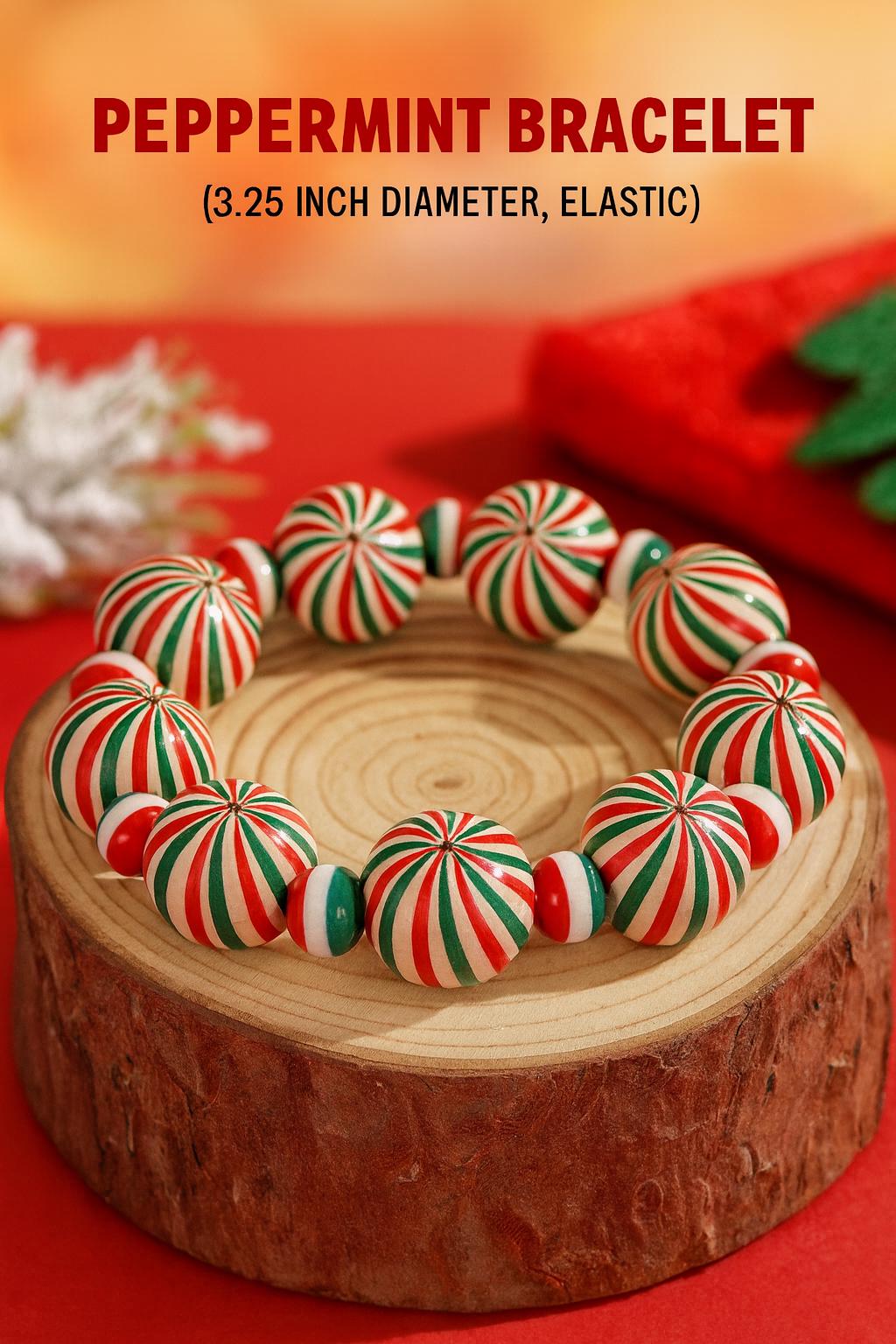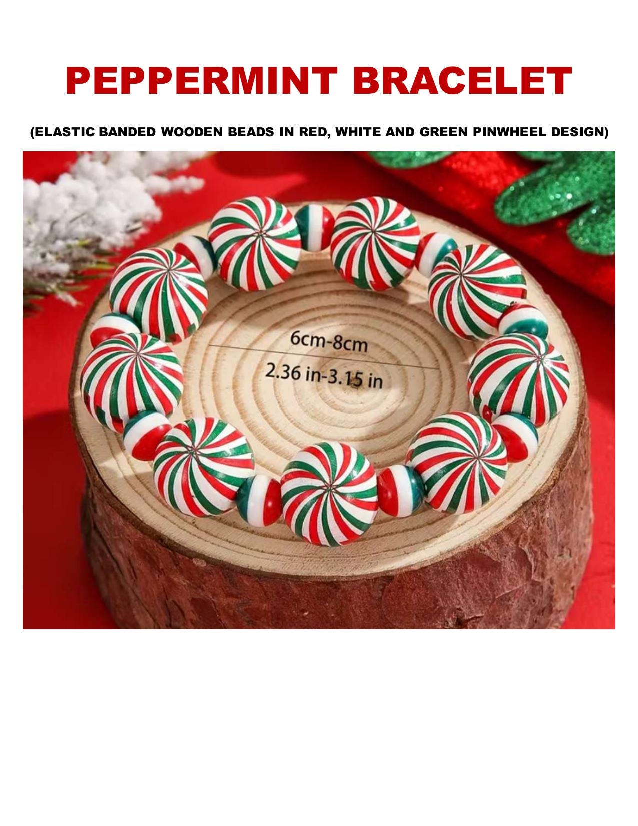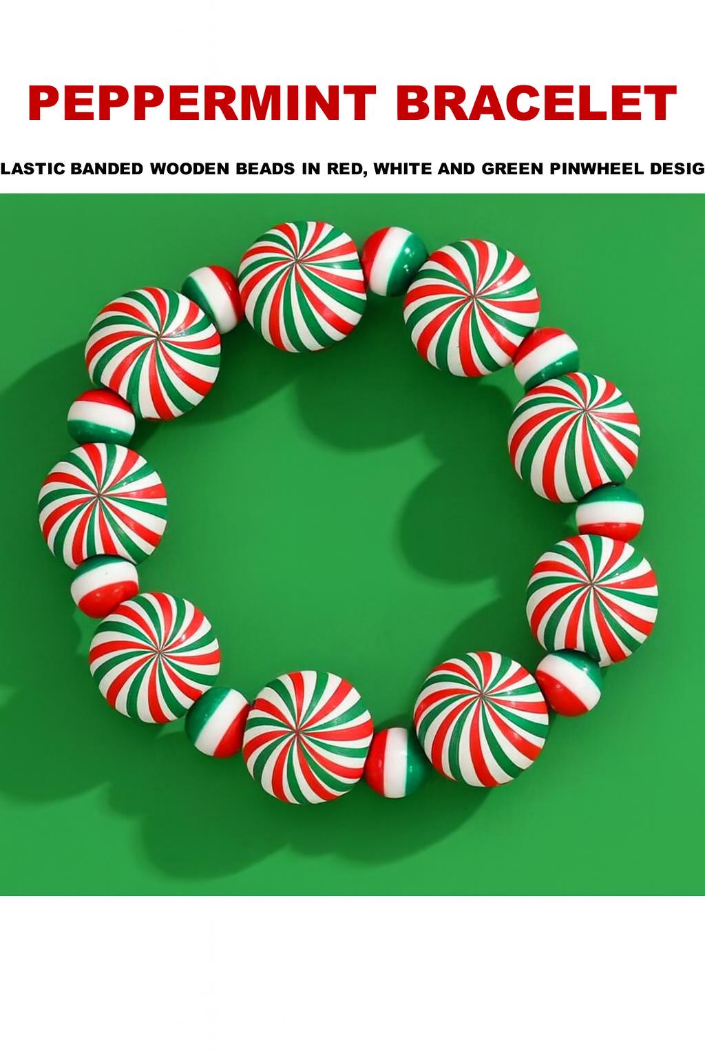 This handcrafted bracelet features elastic-banded wooden beads adorned with a classic red, white, and green pinwheel design, resembling sweet peppermint candies. Perfect for the holiday season, this piece is lightweight, comfortable, and full of festive spirit.