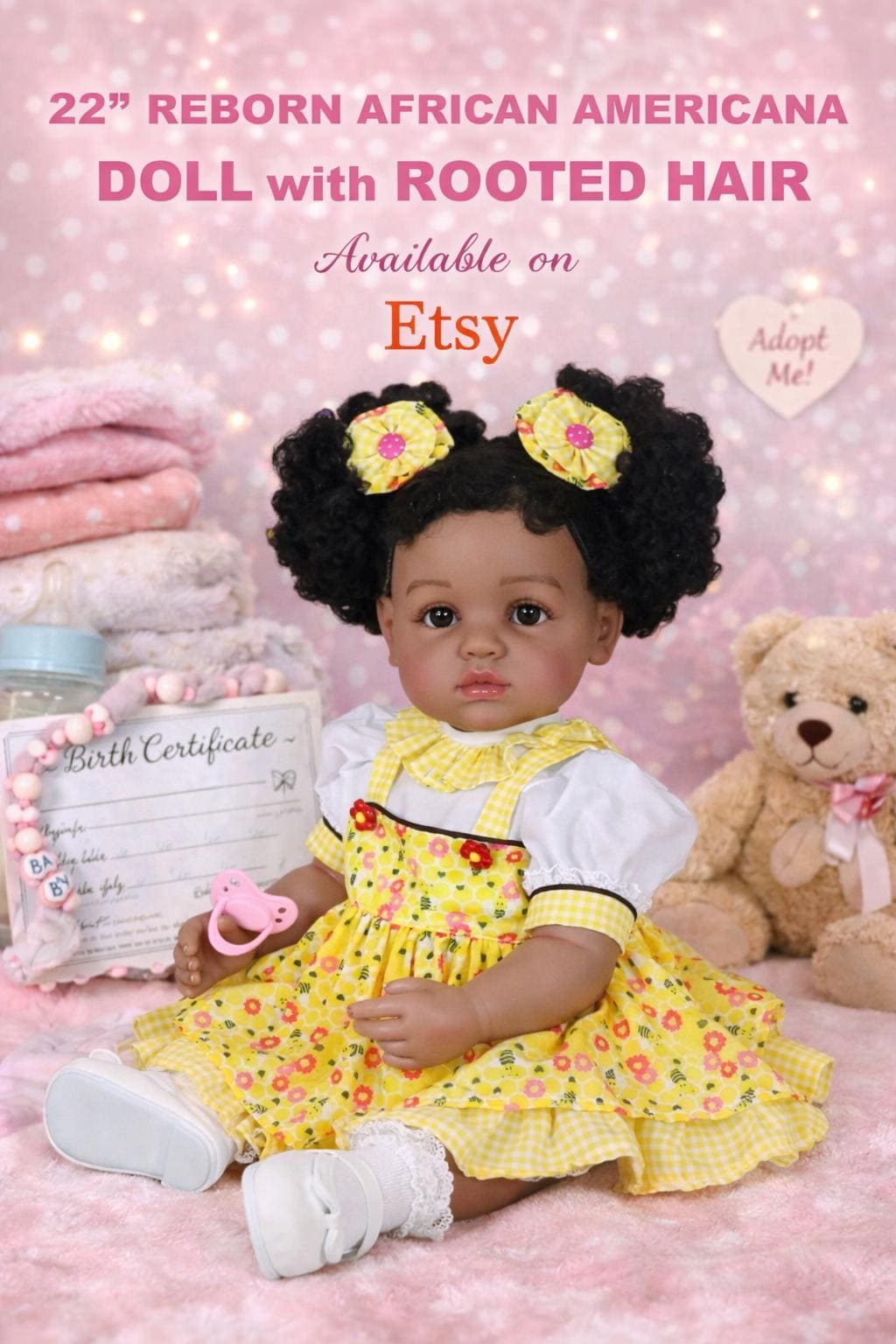 Bring home a one-of-a-kind, beautifully crafted 22-inch reborn doll that celebrates diversity, artistry, and joy. This exquisite Reborn African American doll features a full vinyl body, a hand-painted face with delicate details, and rooted curly black hair styled in adorable puffs with yellow floral hair bows. She’s dressed in a cheerful yellow floral dress with matching tights and white Mary Jane shoes — ready to love and cherish.