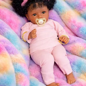 Adorable 17-inch soft rebirth doll featuring a hand-painted lifelike face, realistic blue eyes, and smooth synthetic fiber hair. This charming baby doll wears a cozy pink plush hat and pastel onesie, designed for collectors, kids, and anyone who loves reborn artistry. Crafted from soft polyester fiber for a huggable feel — perfect for cuddles, nursery décor, or thoughtful gifting.
