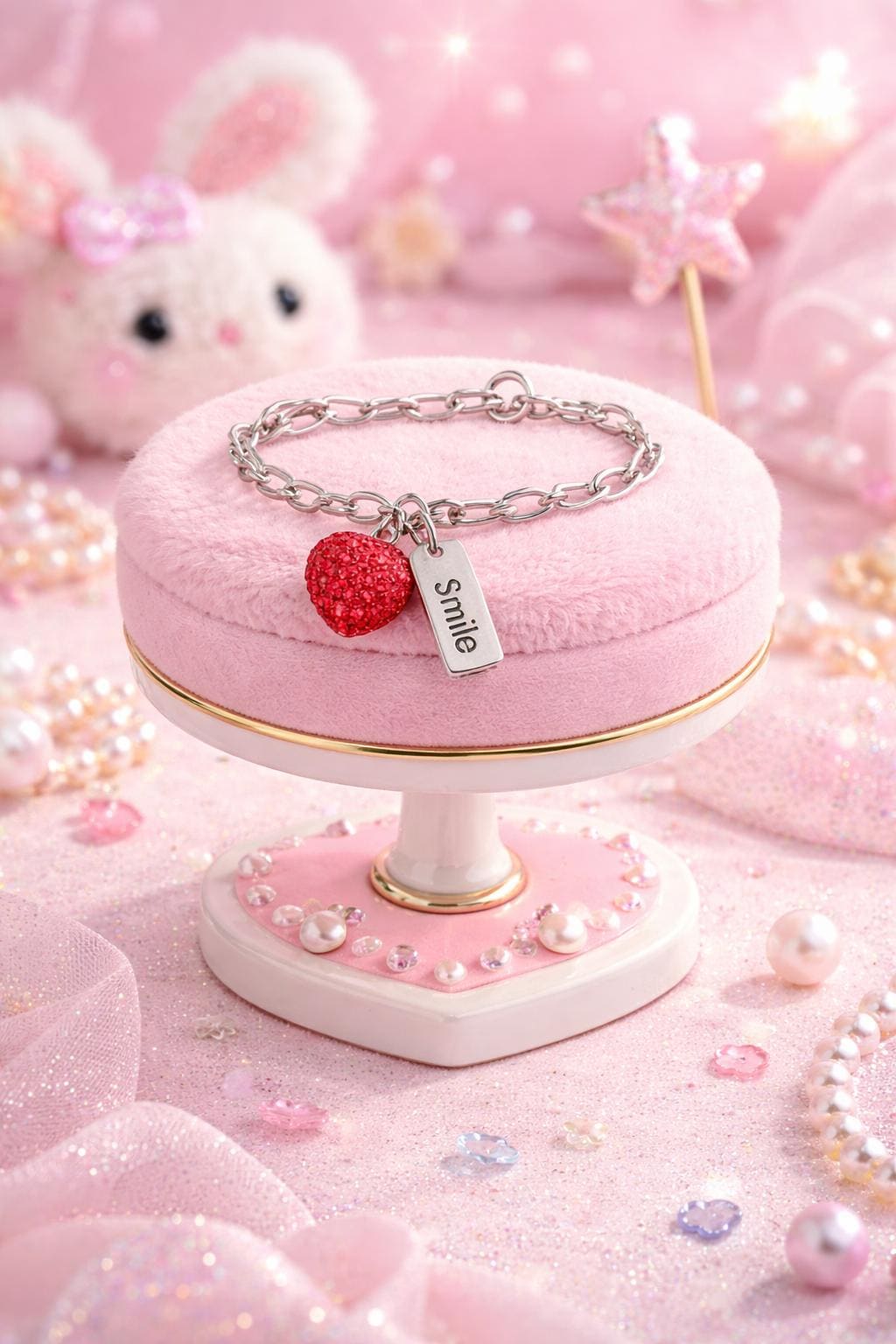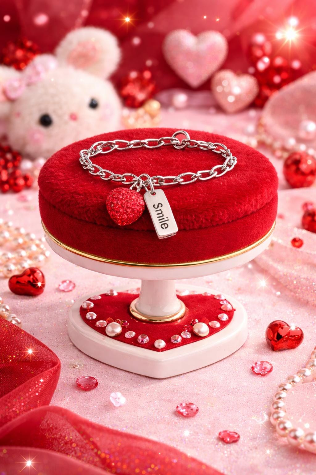 ✨ Sparkly Kids/Adult Adjustable Charm Bracelet – Red Crystal Heart & “Smile” Tag 925 Silver-links