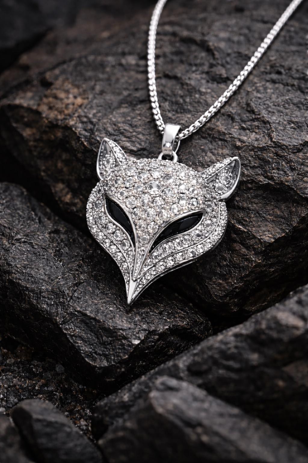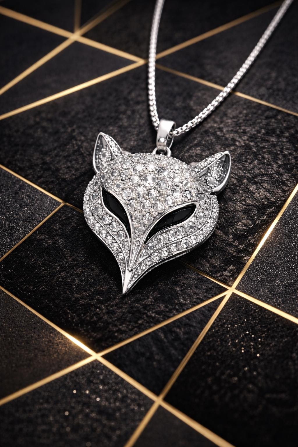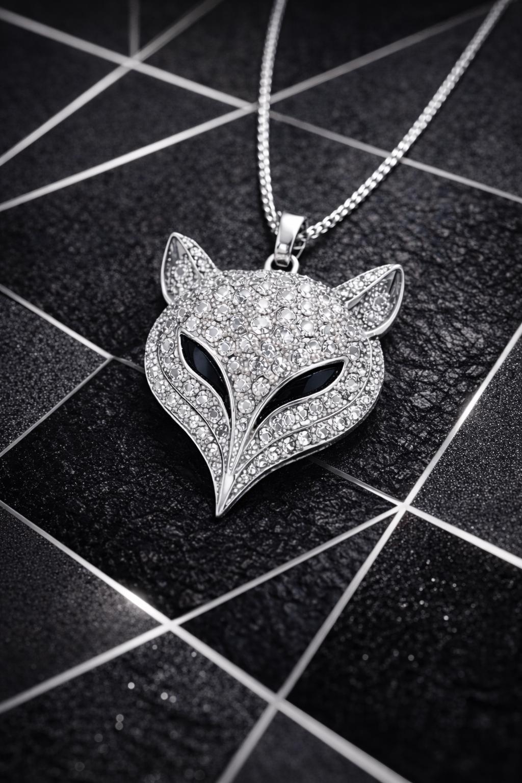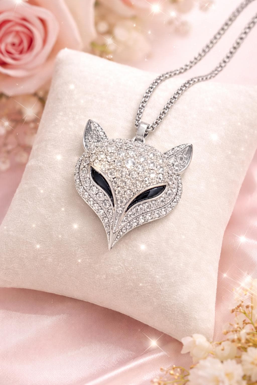 This dazzling fox pendant necklace features a heart-shaped fox silhouette encrusted with brilliant clear rhinestones and accented with sleek black detailing for depth and contrast. The combination of sparkle and shadow creates a bold yet refined look — playful in spirit, sophisticated in finish.