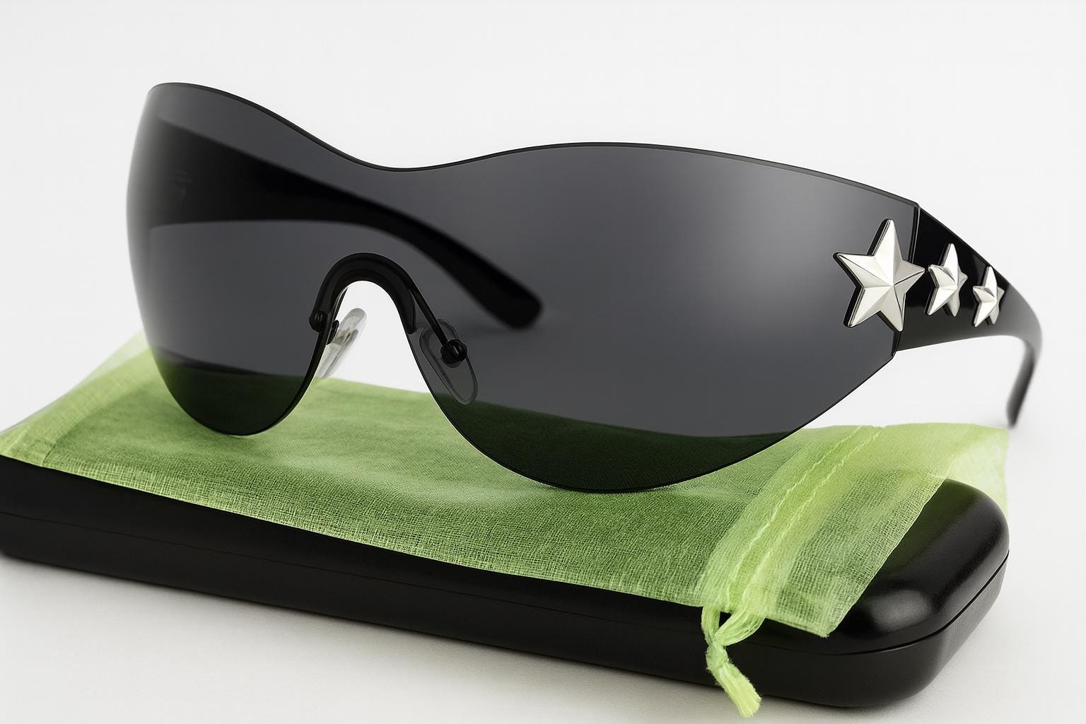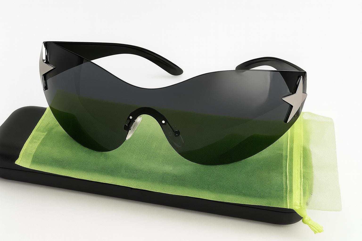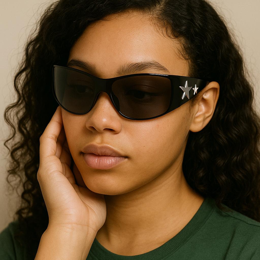 Y2K Star Shield Sunglasses – Oversized Wraparound Shades, Sleek Black Lens, Futuristic Festival Streetwear Look