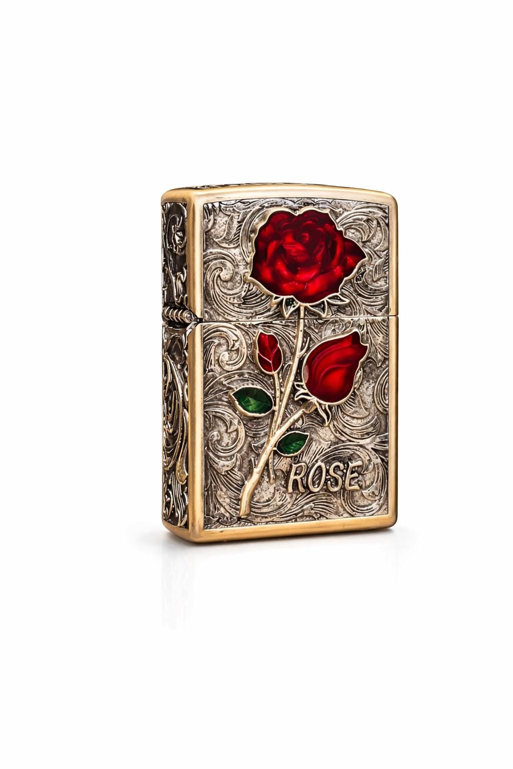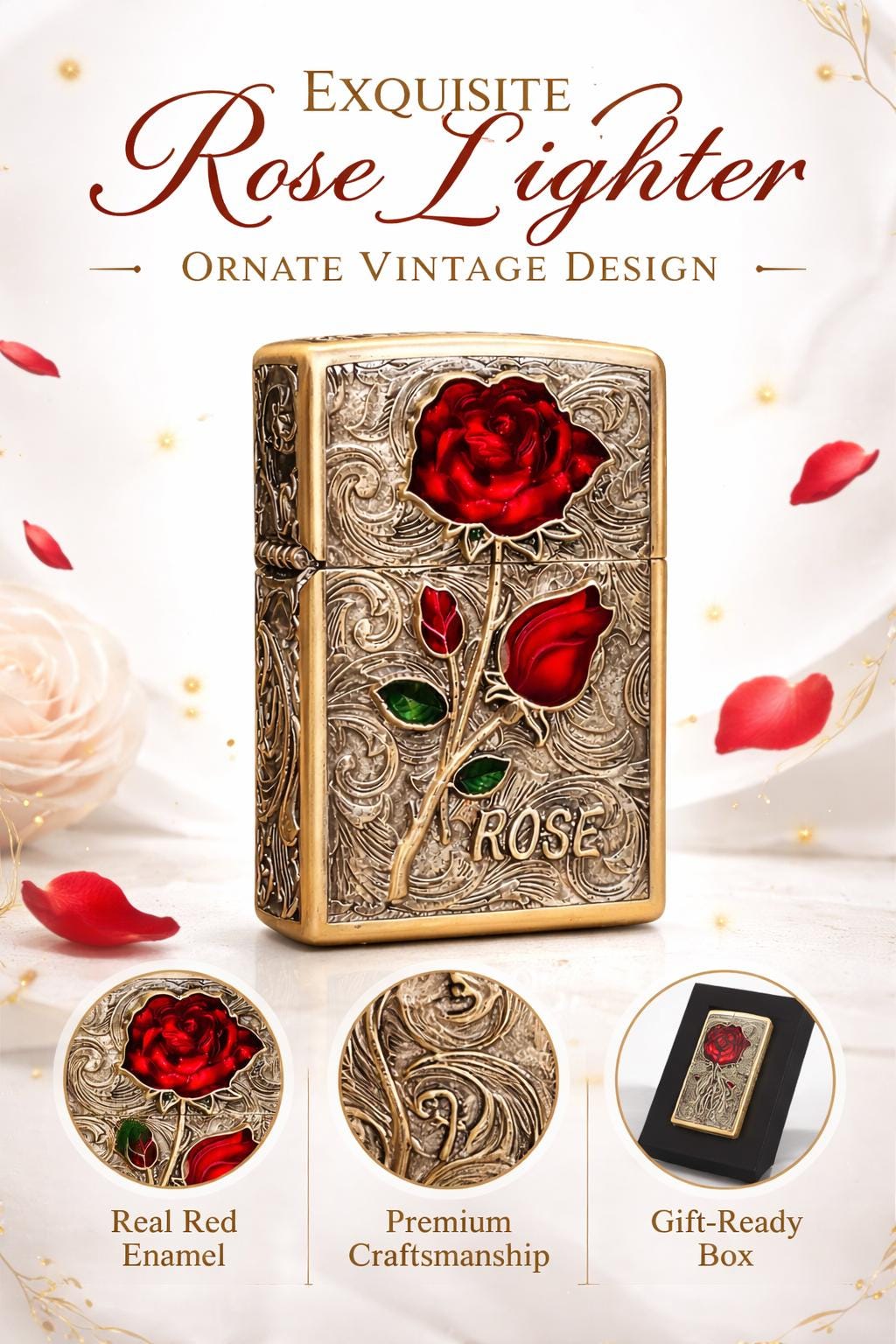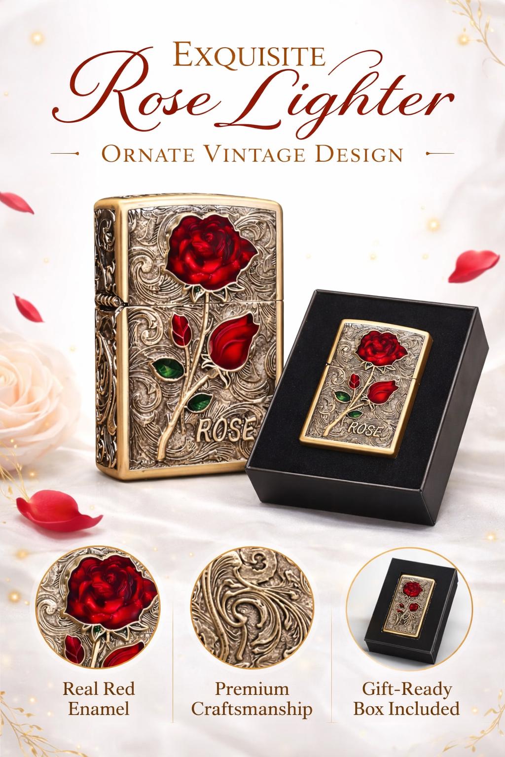Bring timeless elegance to your collection with this rare, vintage-inspired kerosene lighter featuring an ornate engraved metal body and a striking deep red rose centerpiece. The detailed scrollwork design gives it a true antique heirloom look, making it feel like something pulled from an old-world treasure chest—bold, romantic, and built to stand out.