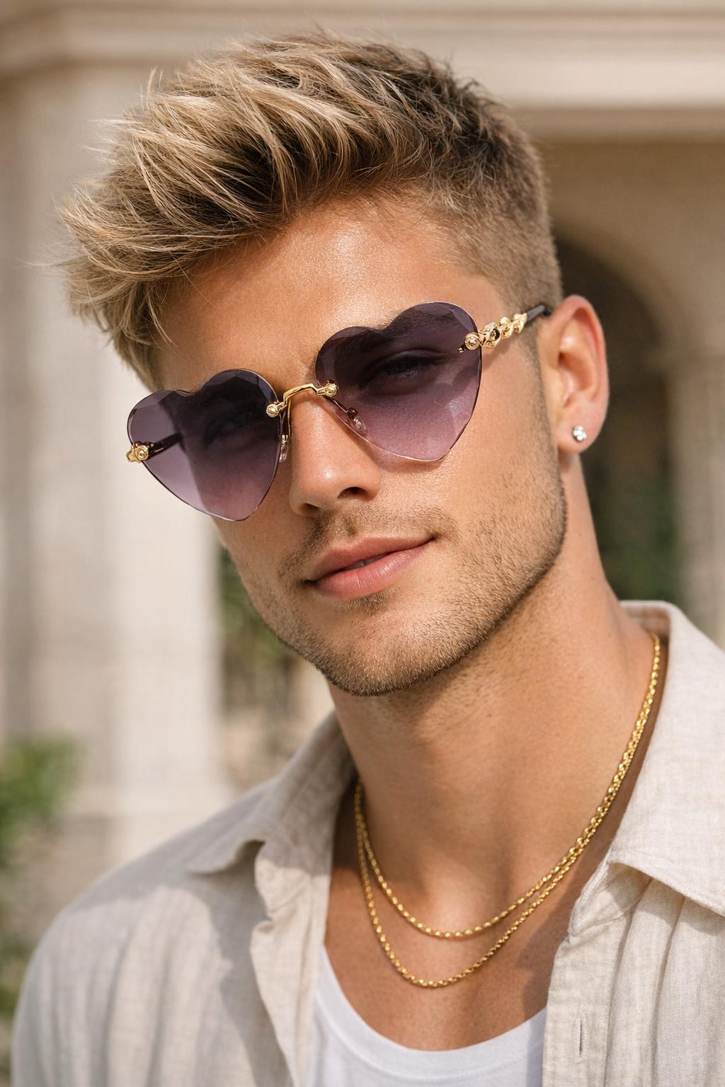Fall in love with your look in these LIMITED Purple iHeart-shaped sunglasses featuring luxe golden frames and handles. Measuring 5.3" L x 5.4" W x 1.9" H, they bring a playful yet stylish vibe perfect for sunny days, festivals, or simply making a bold statement.