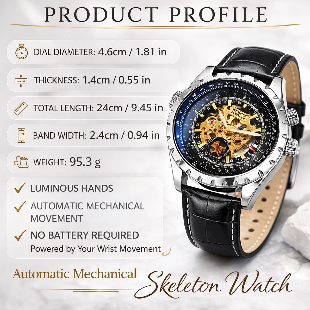Because this is a skeleton watch, part of the movement is visible through the dial, allowing you to actually see the intricate gears and balance wheel working as the watch keeps time. 🌈
