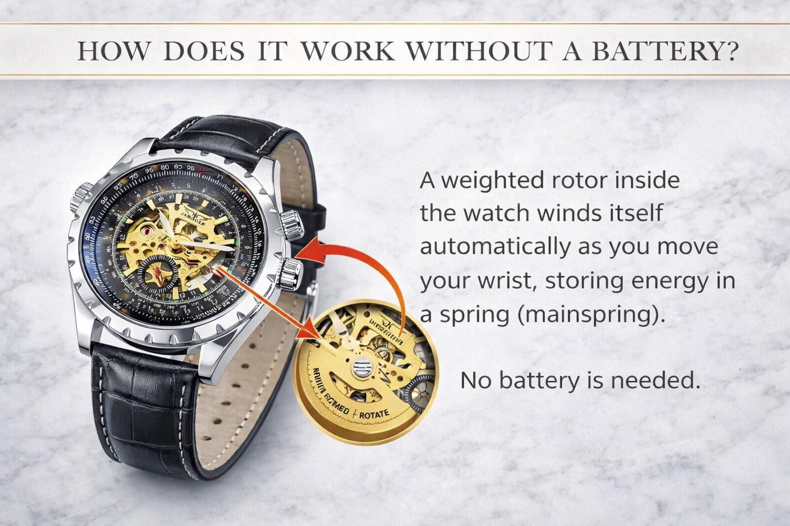 The rotor winds a mainspring, which stores energy like a tightly wound spring.