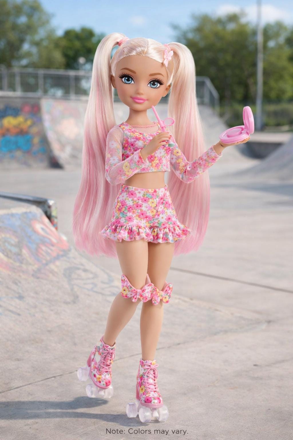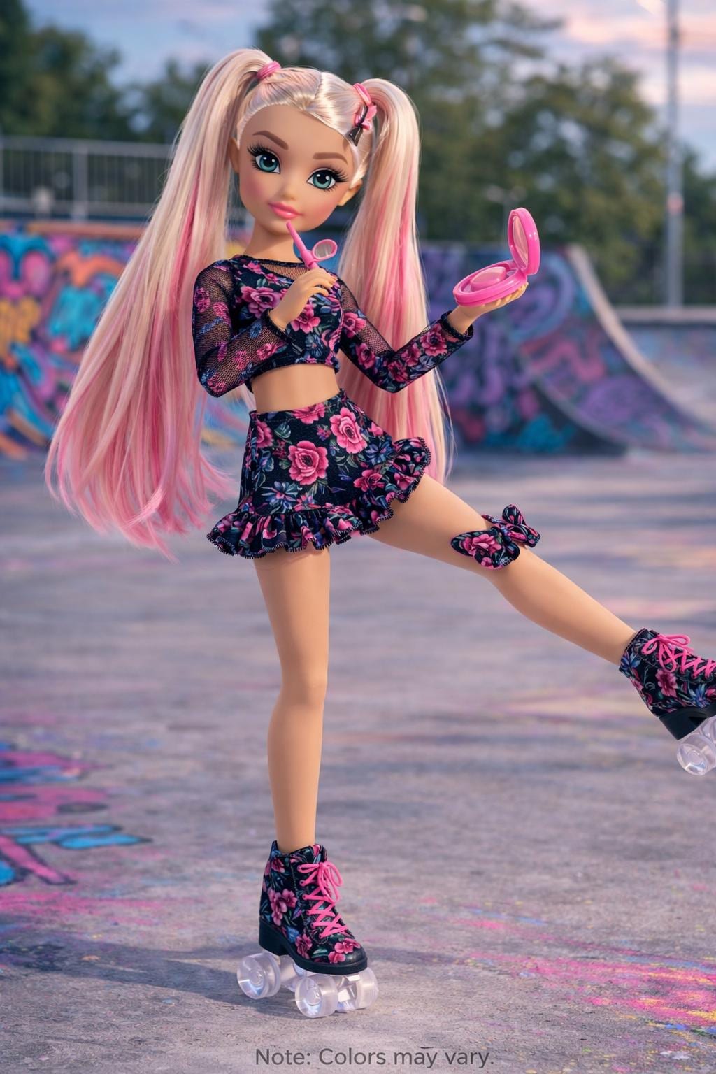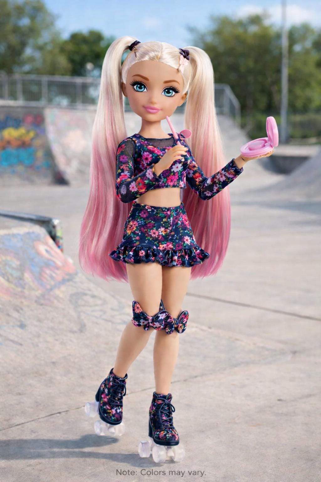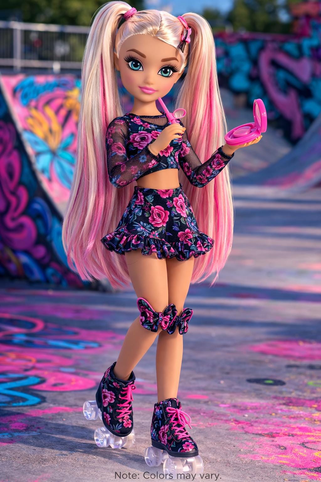 With her long blonde hair featuring pink tips styled in high ponytails, this doll brings a fun skate-park personality to any collection. Her bold skating outfit and matching roller skates create a confident, energetic look that inspires creative play and display.