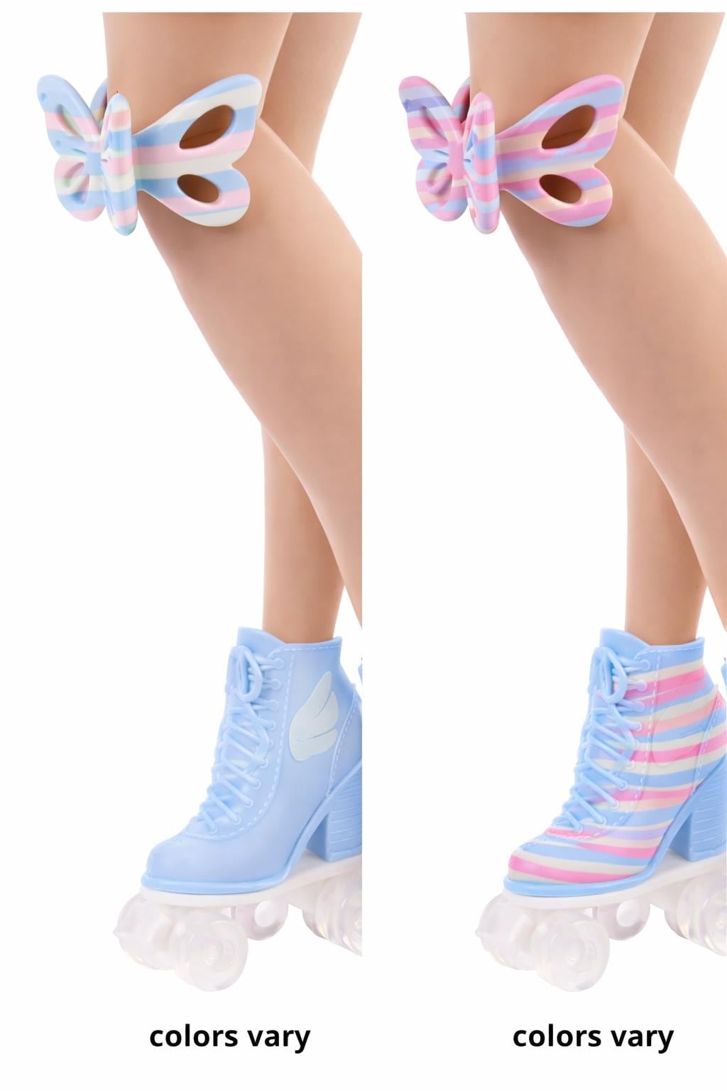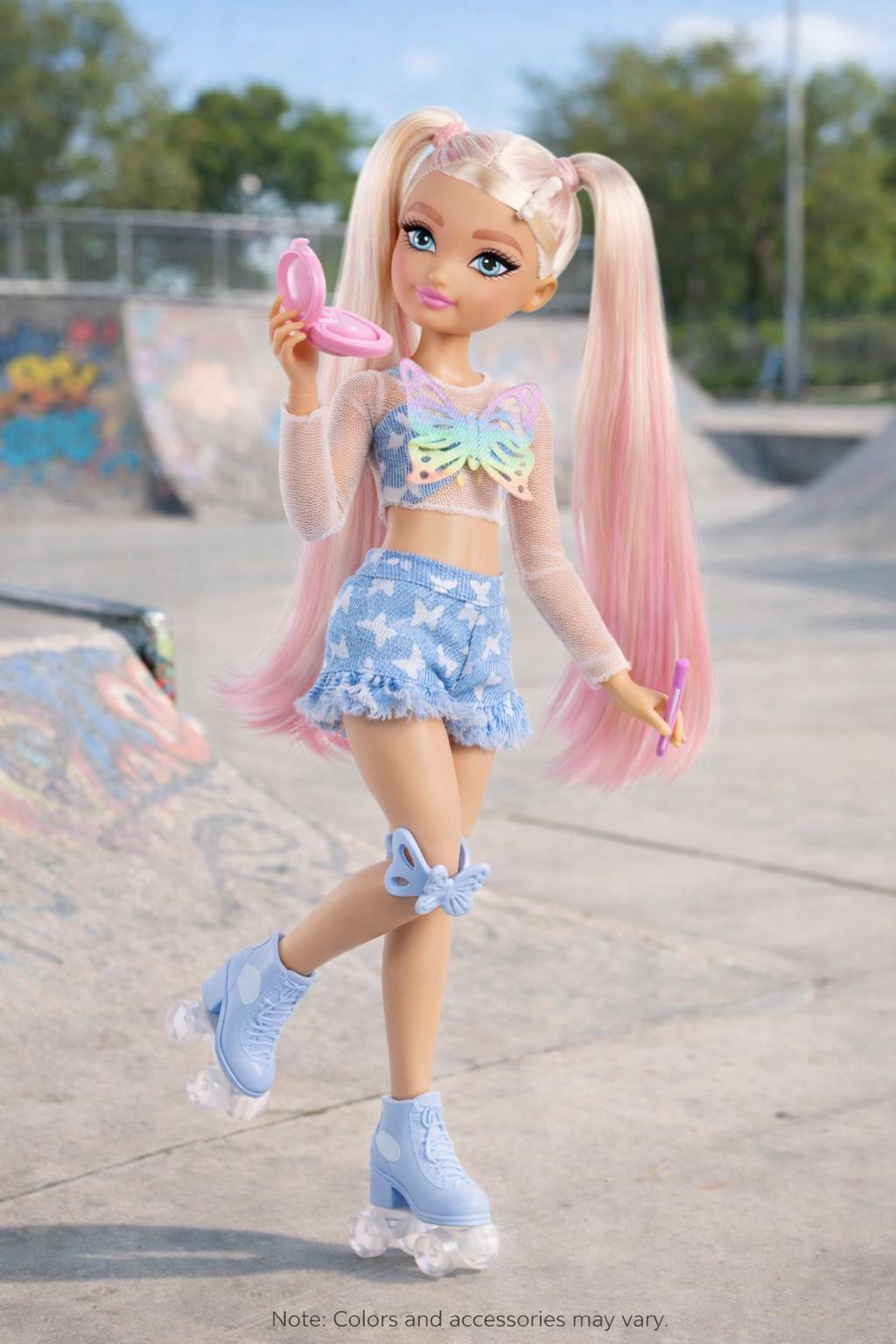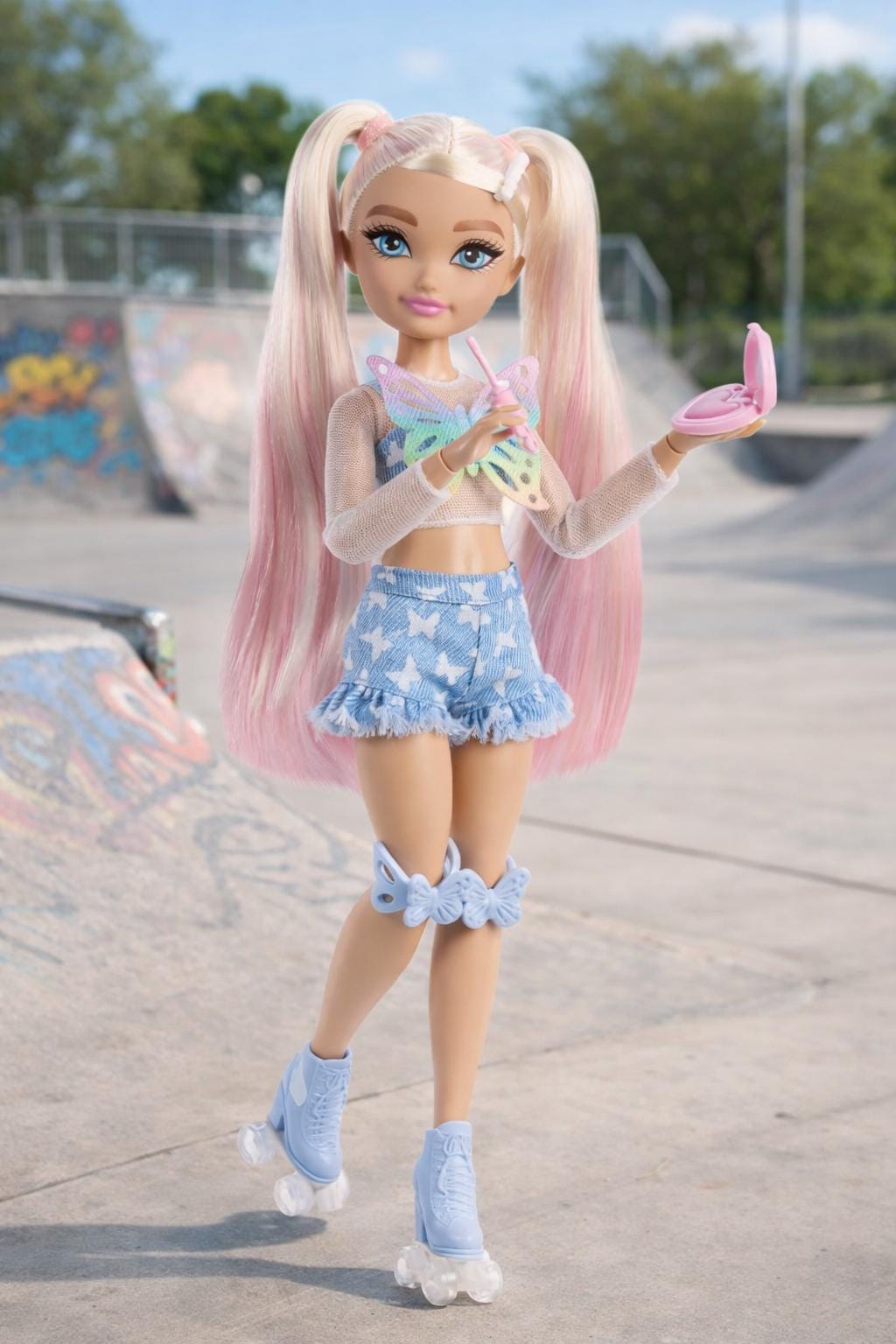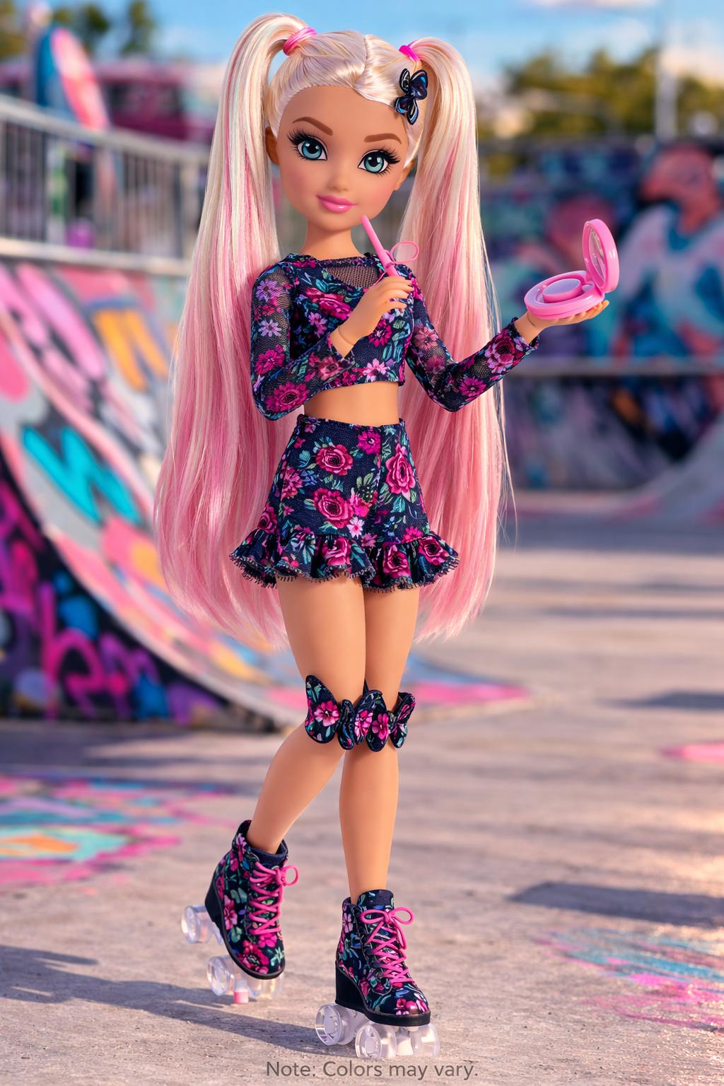With her long blonde hair featuring pink tips styled in high ponytails, this doll brings a fun skate-park personality to any collection. Her bold skating outfit and matching roller skates create a confident, energetic look that inspires creative play and display.
