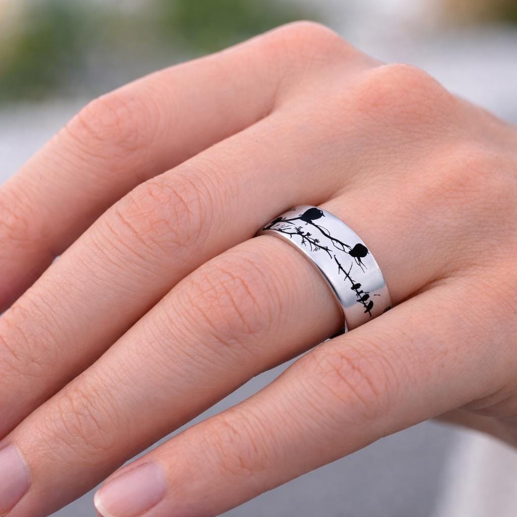 Perfect for lovers of nature jewelry, woodland inspired accessories, bird watchers, minimalist jewelry collectors, and nature themed gifts, this unique band adds subtle personality and elegance to any jewelry collection.