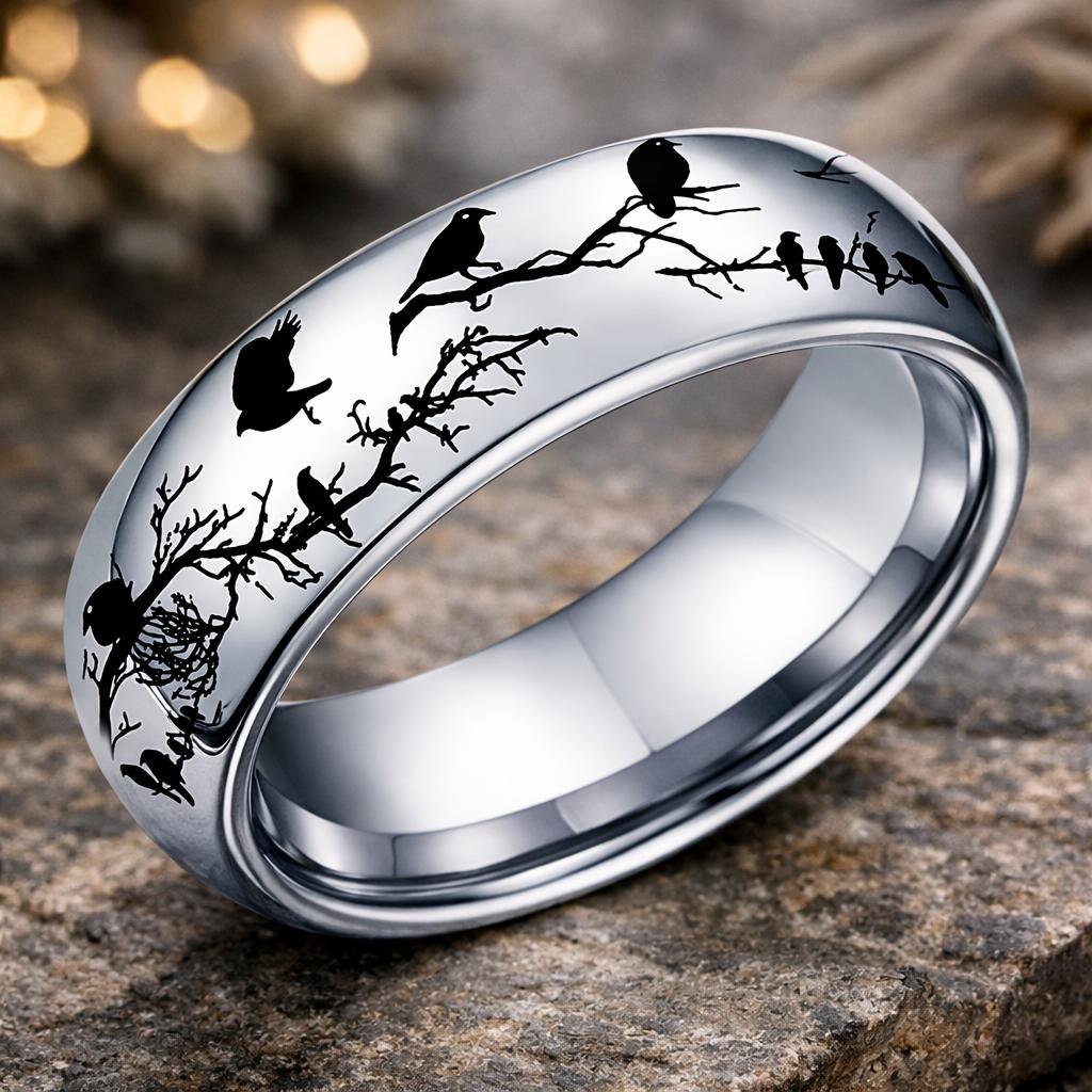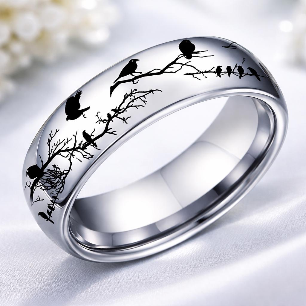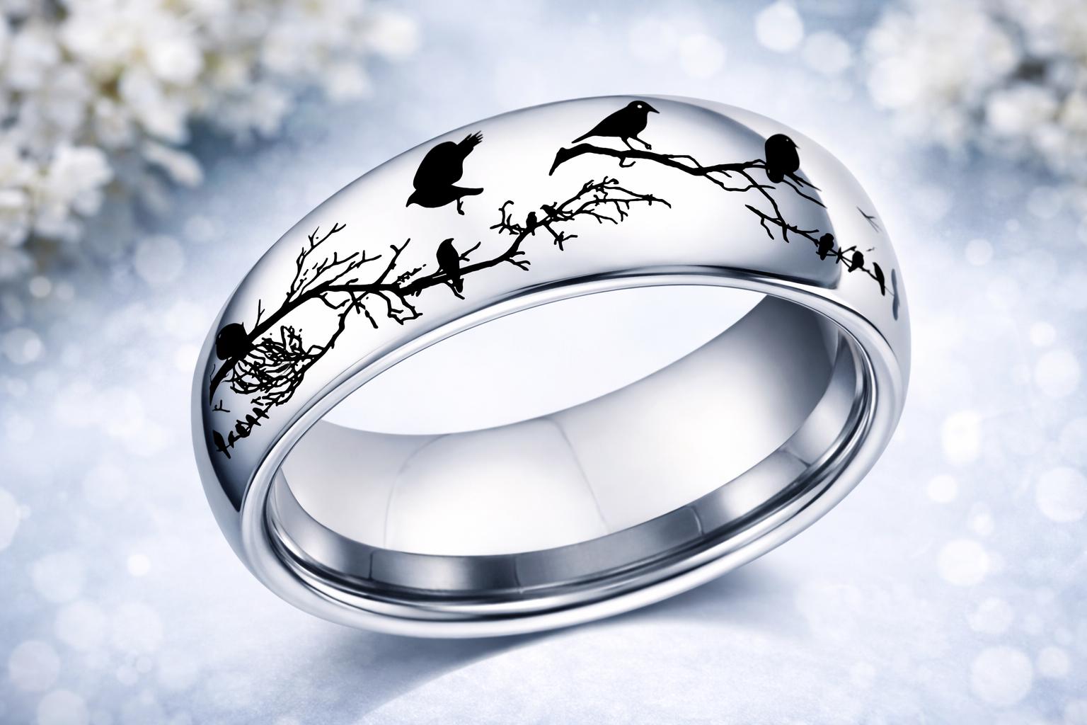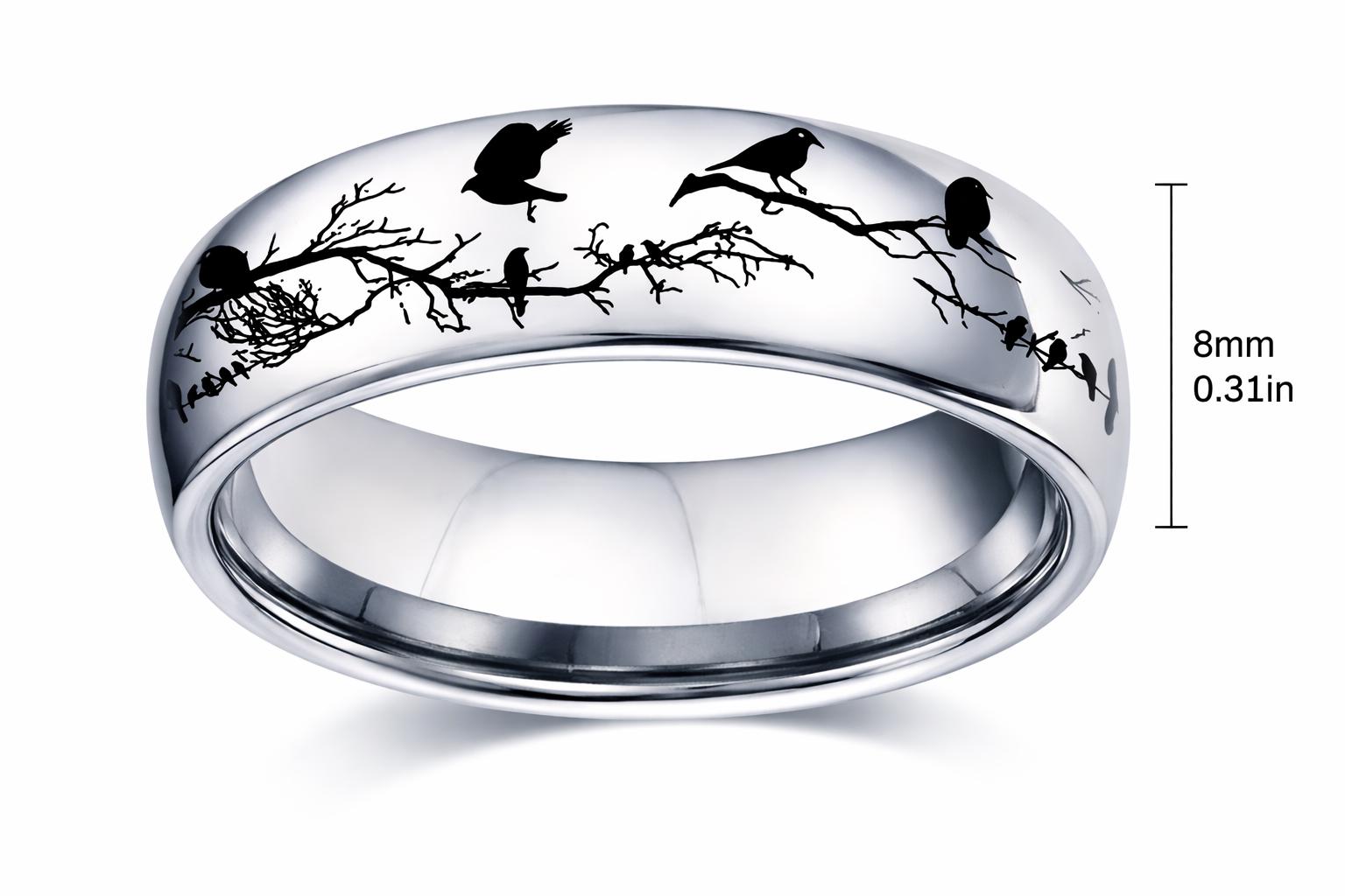 This beautifully detailed bird branch engraved ring features elegant silhouettes of birds perched along intertwining branches, creating a serene woodland scene that wraps completely around the band. The polished stainless-steel finish reflects light beautifully, highlighting the delicate contrast between the smooth metal surface and the striking black bird design.