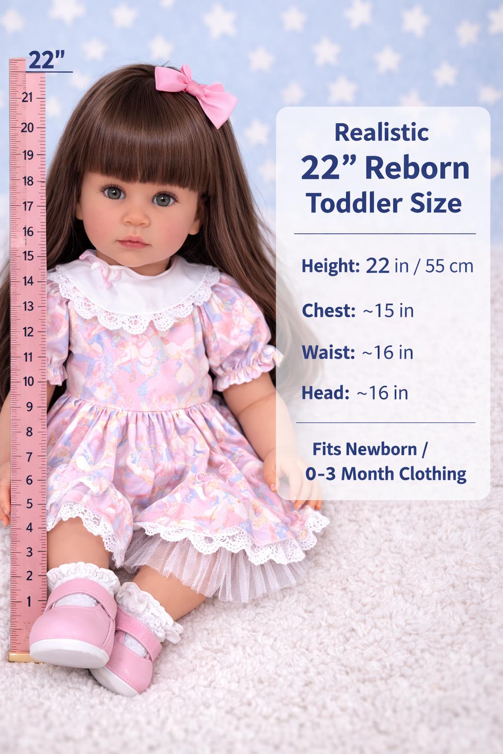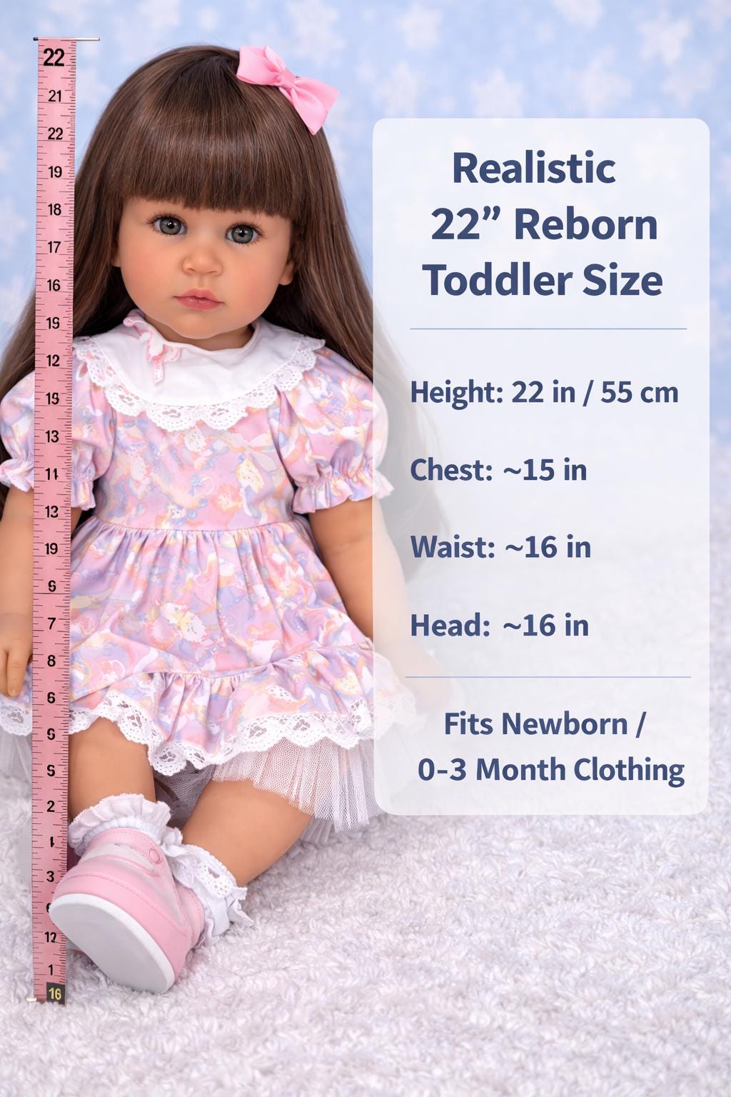 Bring the sweetness of childhood to your reborn collection with this 22-inch realistic reborn toddler doll. Designed with lifelike details and a soft cloth body, this beautiful baby girl doll is perfect for collectors, reborn nurseries, and meaningful gifts.